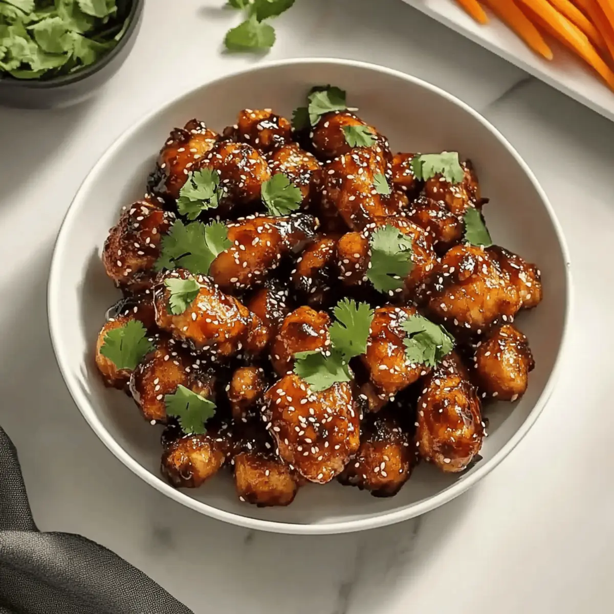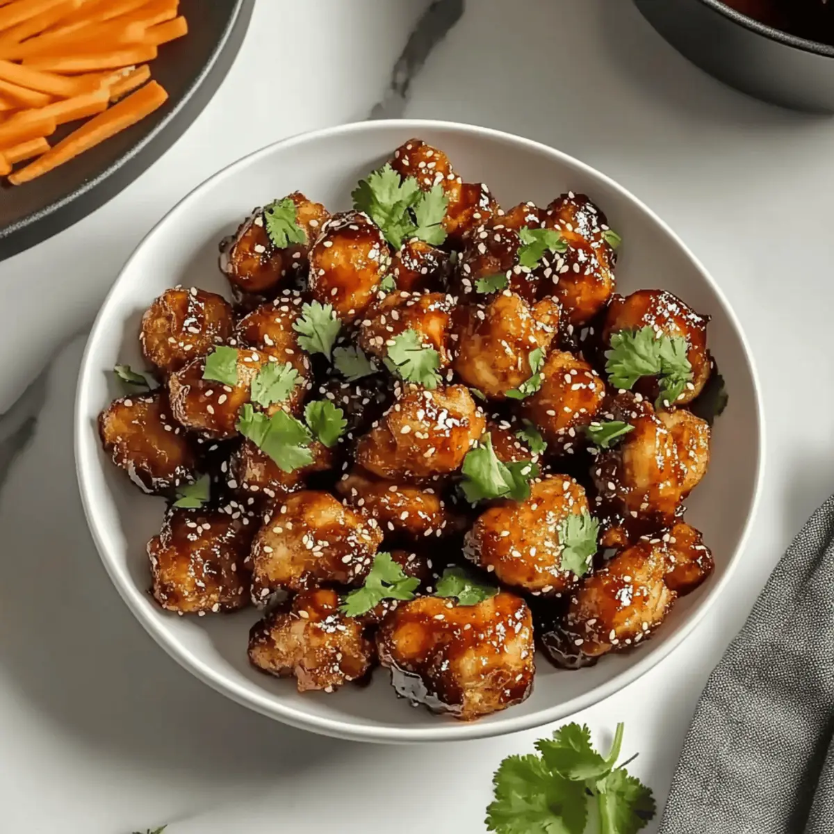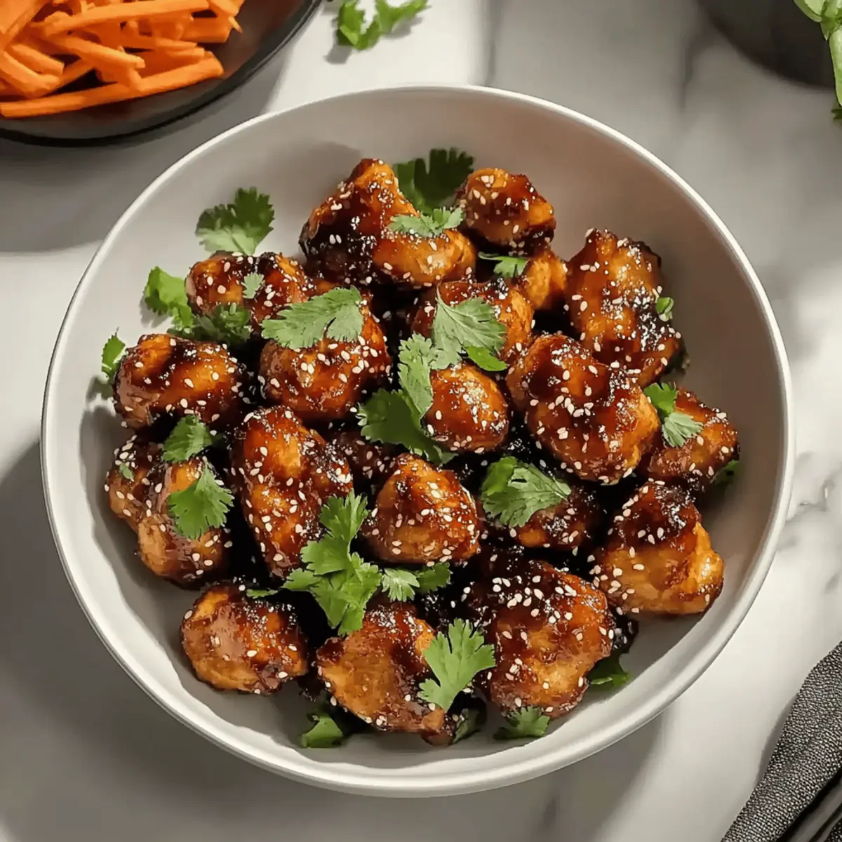 In a large bowl, gently toss the fried chicken bites with sweet chili sauce until well-coated. This adds that essential sweetness and warmth to your Thai Chicken Bites. Finally, garnish with sesame seeds, julienned carrot for crunch, and freshly chopped cilantro. Serve these delicious bites warm and watch them disappear!
