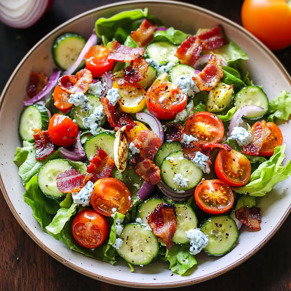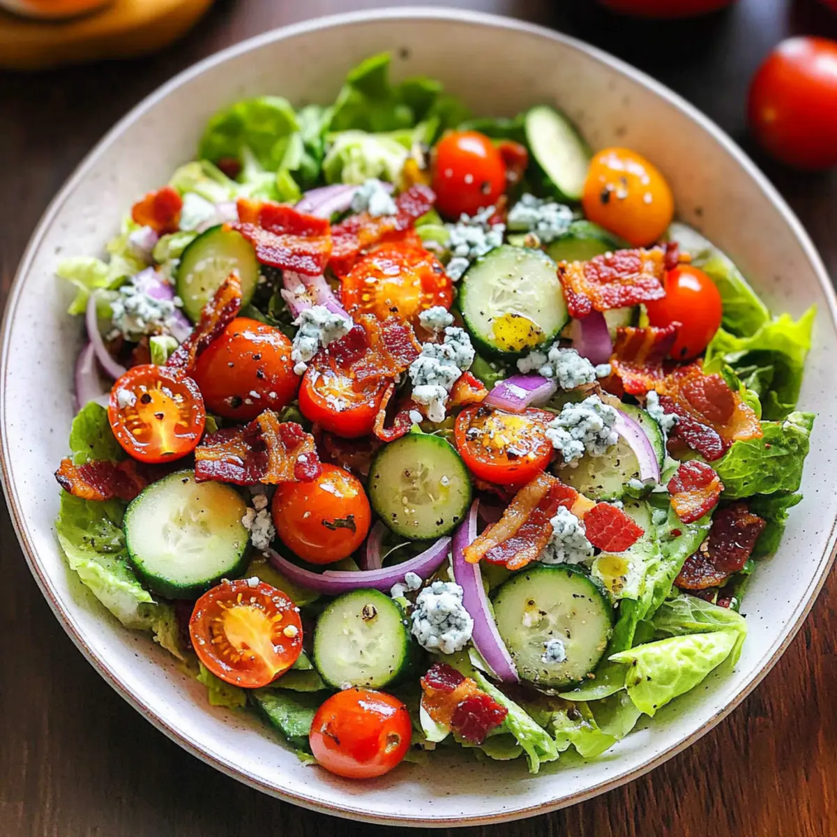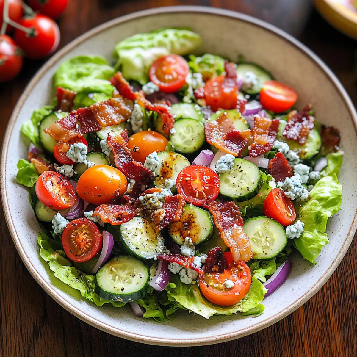 These Tomato Cucumber Lettuce Salad components are perfect for meal prep, saving you valuable time on busy weeknights! You can prepare the blue cheese dressing up to 3 days in advance. Simply whisk together Greek yogurt, lemon juice, crumbled blue cheese, half-and-half, salt, and pepper, then store it in an airtight container in the fridge. The salad ingredients, like chopped lettuce, tomatoes, cucumber, and red onion, can be prepped 24 hours ahead; just keep them in a sealed bowl or container to maintain freshness. When you’re ready to serve, toss everything together with the dressing and add the crispy bacon right before serving for that delightful crunch. This way, you’ll enjoy a delicious, fresh salad without the last-minute rush!