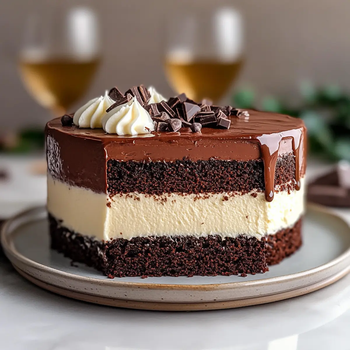 Once the cakes are completely cooled, place one layer on a serving plate. Spread an even layer of dark chocolate mousse on top, then carefully add the second cake layer. Top this layer with the white chocolate mousse, smoothing it out with a spatula for a sleek finish. Refrigerate the cake for at least 2 hours to allow the mousses to set perfectly.