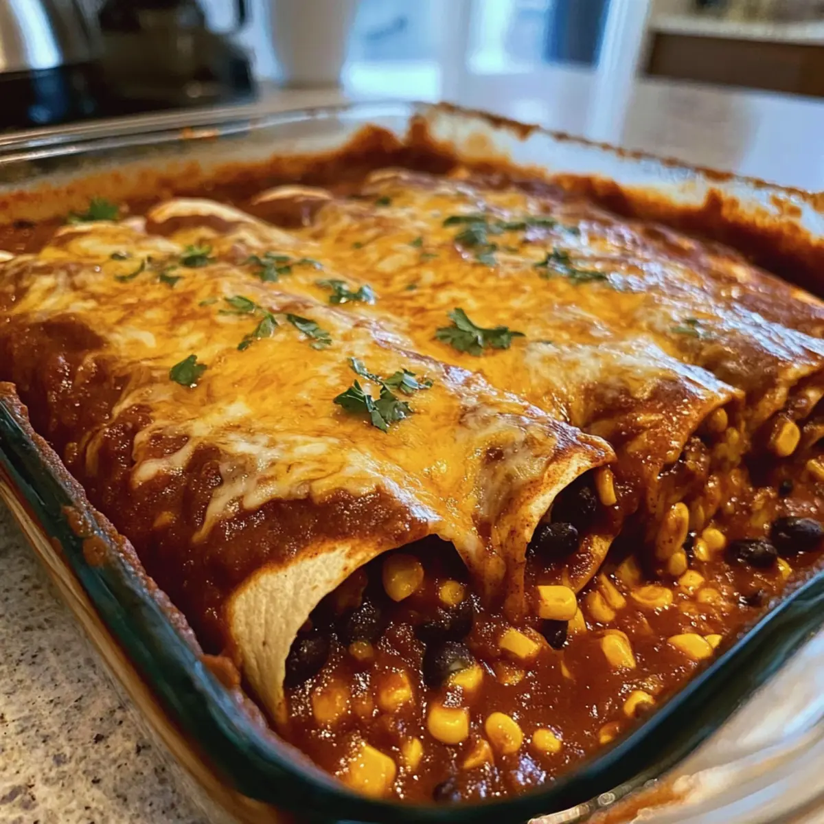 Once all enchiladas are nestled in the dish, generously pour 2 cups of enchilada sauce over the top. Sprinkle with 1-2 cups of shredded Monterey Jack cheese for that rich, gooey finish. Make sure every enchilada is well-coated to achieve that perfect cheesy melt as they bake.